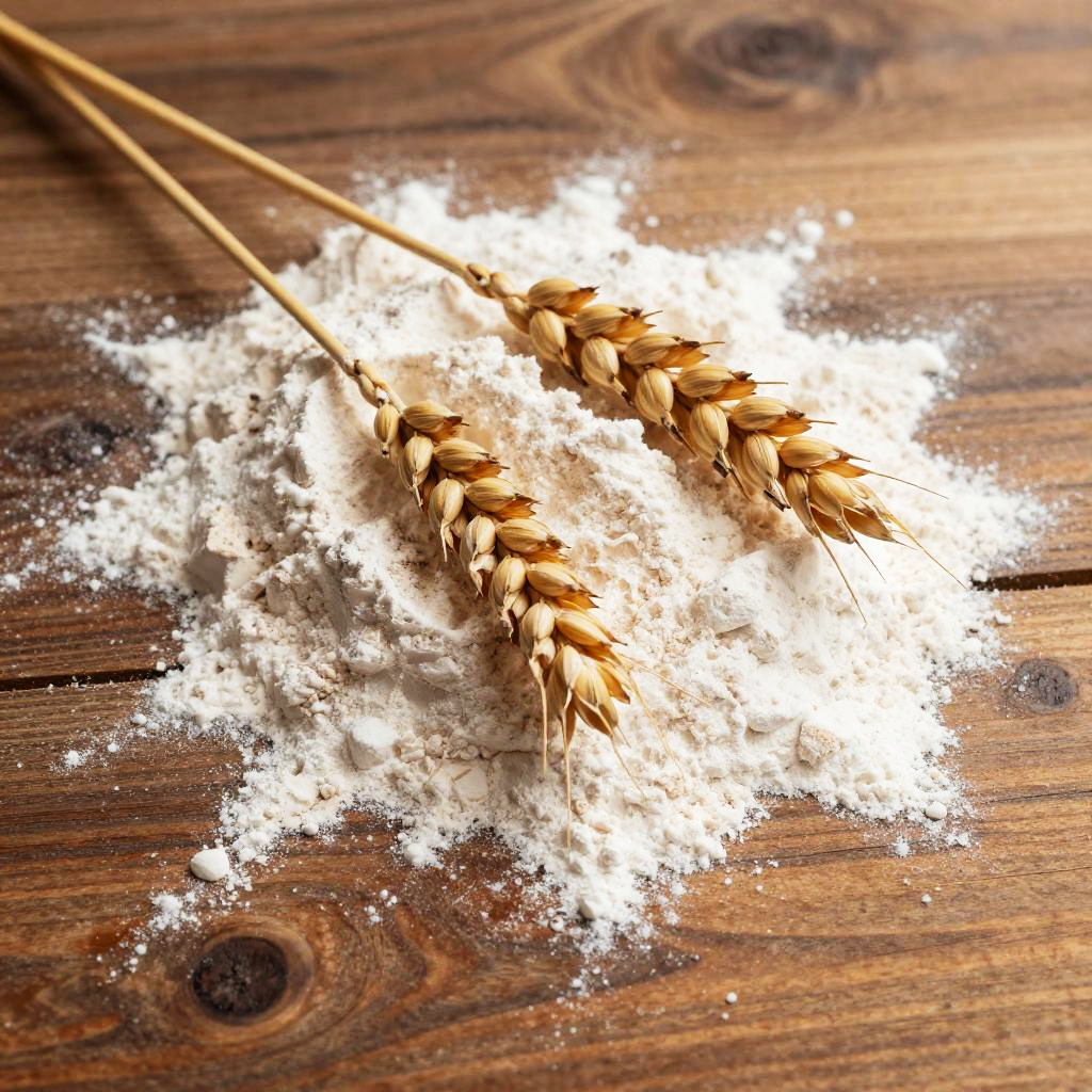 Photograph of two golden wheat stalks resting on a wooden surface, surrounded by a small mound of white flour.
