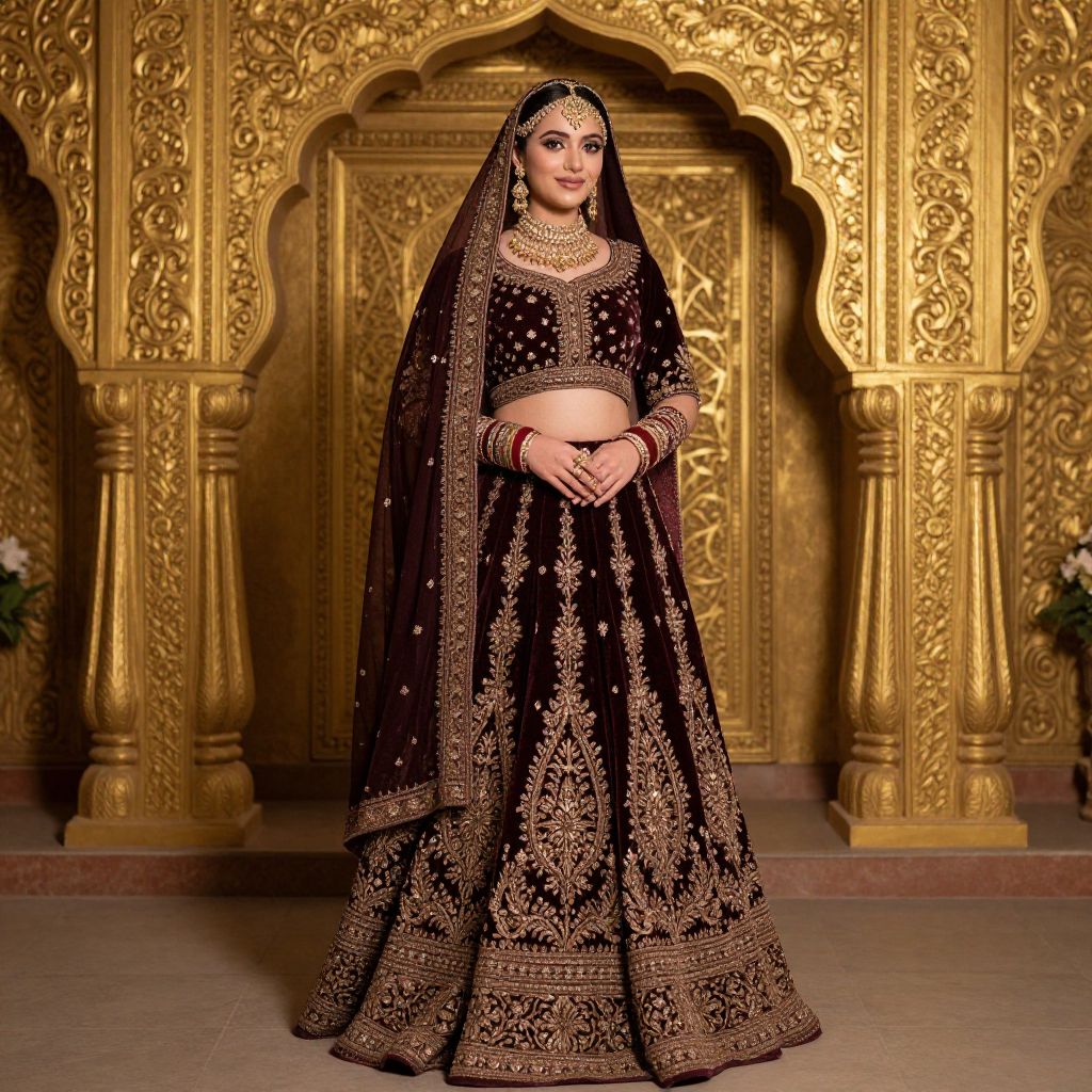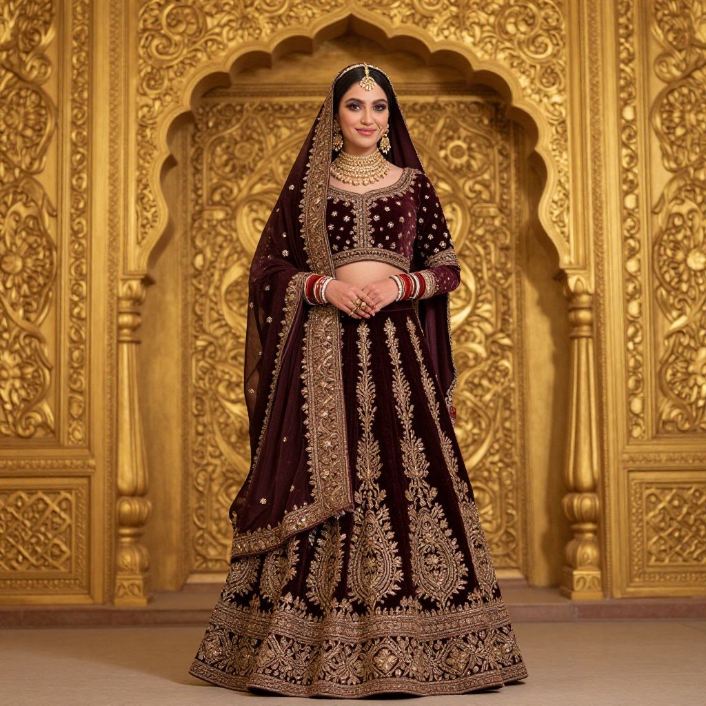 A photograph of a beautiful South Asian woman in traditional bridal attire standing in front of an ornate, golden Mughal-style archway. She's wearing a rich, dark maroon velvet lehenga adorned with intricate gold embroidery, a matching dupatta, and a detailed gold headpiece. Her makeup is elegant, and she has a confident smile. The background features intricate gold carvings and columns.
