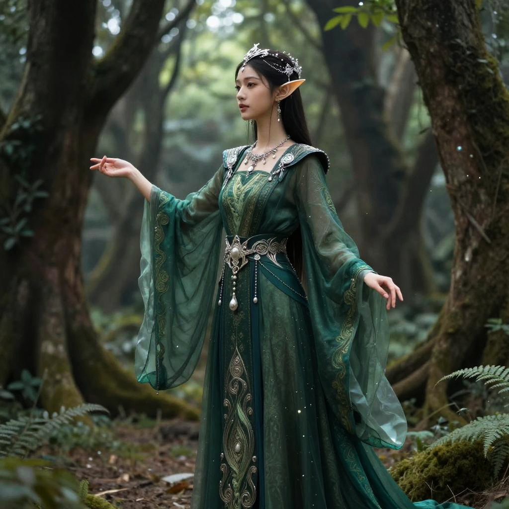 Elegant elf standing gracefully in an ancient forest, adorned with delicate silver jewelry and flowing emerald robes, ethereal light filtering through the leaves, mystical atmosphere, intricate patterns on clothing, serene and poised expression