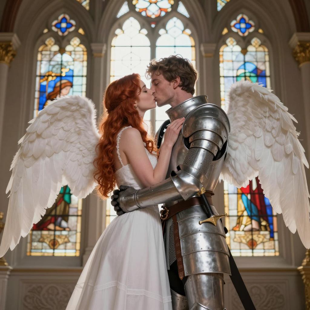 Couple kissing. Angelic woman with white wings, long brown hair, white dress, embracing armored man with short brown hair, gray vest, black pants. Background: dark clouds, glowing candlelit chandeliers, circular patterned wall. Romantic, passionate embrace. Both eyes closed.