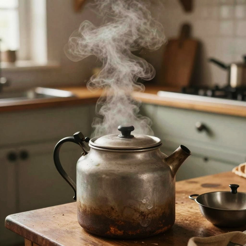 Kochendes Wasser in einem alten eisernen Kessel, aufgehender Dampf umgibt den Kessel, rustikale Küche im Hintergrund, warmes Licht, fotorealistisch, detailreich und atmosphärisch, natürliche Farben