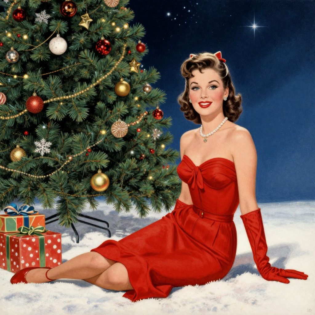 A vintage pin-up illustration by Gil Elvgren captures a festive Christmas Eve scene, featuring a glamorous woman in a red dress and gloves, sitting gracefully beside a decorated Christmas tree and gift box under a starry night sky, evoking a classic retro aesthetic.