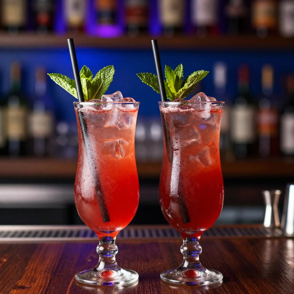 Photograph of two vibrant red cocktails in elegant, tall, clear glasses with green mint leaves on top. The drinks are filled with ice and have a black straw each. The background is a blurred, colorful bar scene with blue and purple lights. The glasses are on a dark wooden surface, creating a stark contrast with the bright red cocktails.