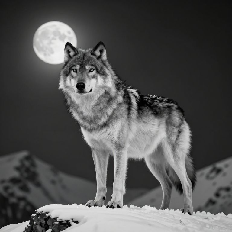 Black and white wolf standing majestically on a snowy mountain peak under a full moon, detailed fur texture, mystical atmosphere, high contrast, cinematic lighting
