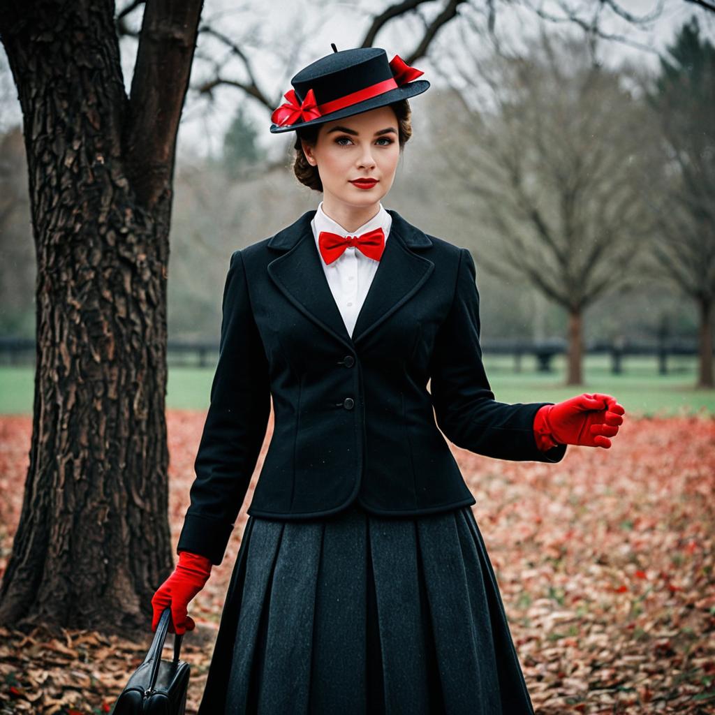 Portrait of a woman wearing a Mary Poppins inspired costume, featuring a black jacket, pleated black skirt, white shirt, red bowtie, red gloves, and a black hat with a red ribbon and bow. She stands outdoors near a tree with a blurred autumnal background of fallen leaves and bare trees, looking directly at the viewer. The outfit is detailed with classic vintage styling and vibrant red accessories.
