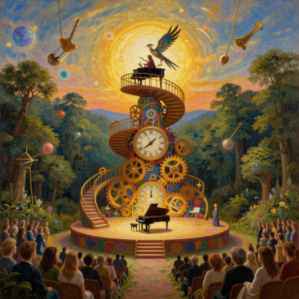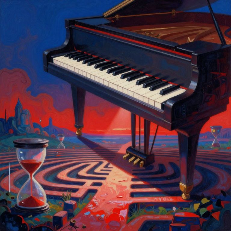 A dreamlike digital artwork fuses abstract expressionism's vivid hues with surreal landscapes, featuring an elevated grand piano hovering above an otherworldly terrain of melting hourglasses and fantastical vistas. The unusual vantage point zooms in on the piano keys, morphing them into a labyrinthine network of pathways that spark both intrigue and unease. A single spotlight from below casts dramatic shadows across the terrain, emphasizing the textured surfaces and illuminating the rich color spectrum ranging from deep blues to fiery reds, creating an intense emotional gradient that captivates viewers as familiar elements are juxtaposed in an utterly fantastical setting.