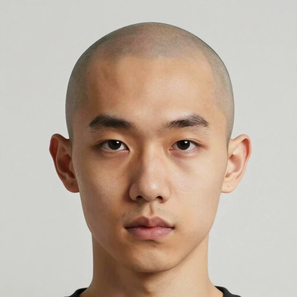 Make me bald filter applied to a realistic human portrait, smooth scalp with natural skin texture, soft lighting highlighting the contours of the face, high-resolution digital art style, subtle shadows for depth, neutral background.