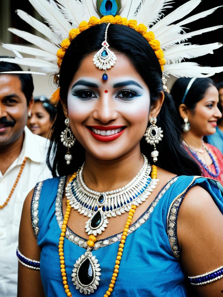 Woman in Krishna Janmashtami Costume with Feathered Headdress