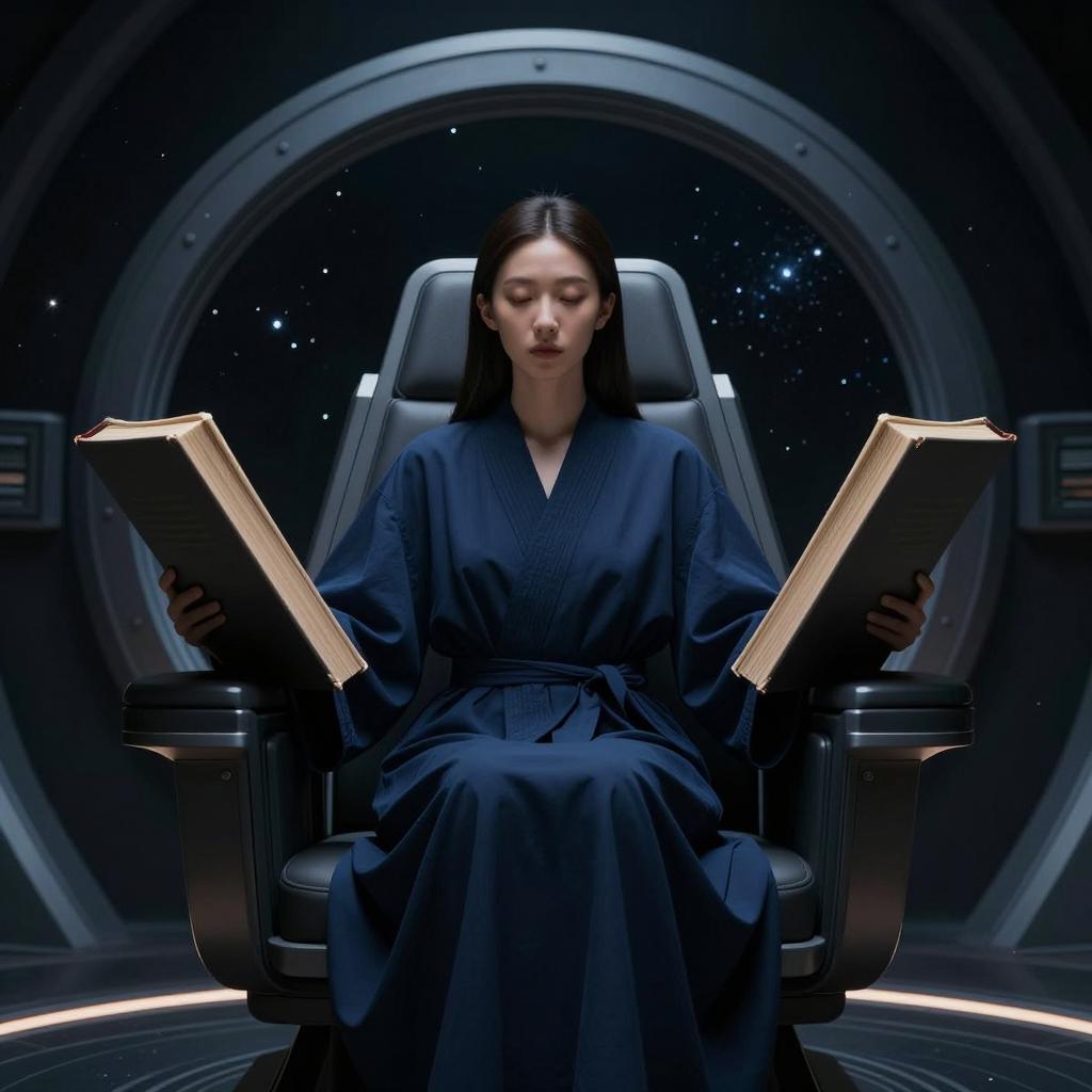 Two Asian women posing side by side against a gray and white geometric background. The woman on the left wears a white and blue futuristic dress with structured shoulders and a circular white and blue headpiece, her eyes closed with a neutral expression. The woman on the right wears a sleeveless teal dress accessorized with a double-strand pearl necklace, green earrings, striking green eyeshadow, and a peacock feather headband, her head tilted back and eyes closed with an intense expression. The image contrasts futuristic and vintage-inspired fashion styles.