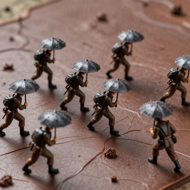 An Army of porcelain figurines marches across a chocolate-brown map, planning strategies with tiny umbrellas in a rain-warped miniature guerilla campaign.