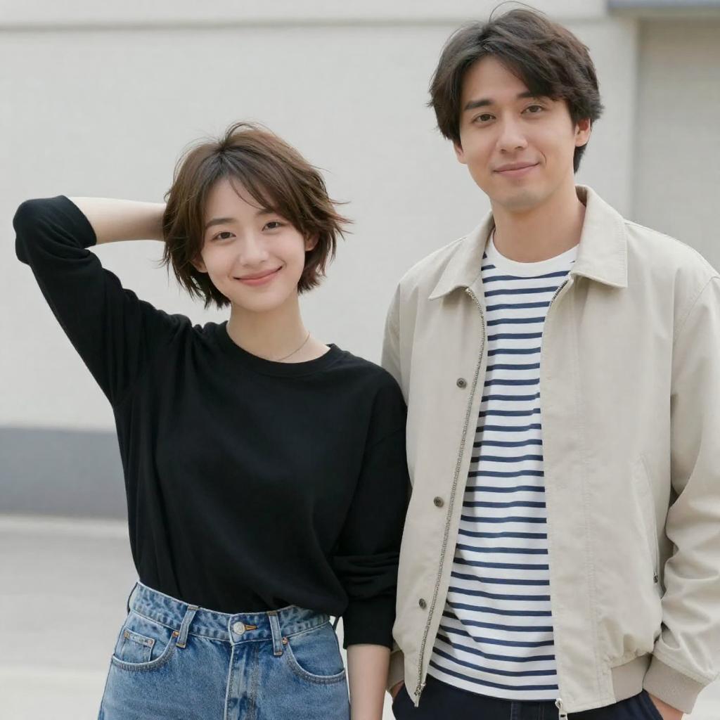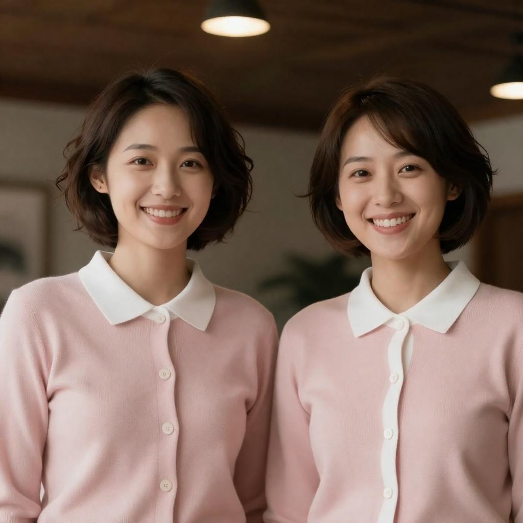 Photograph of two women with short, wavy brown hair, wearing pink cardigans with white collars and buttons, smiling. Dimly lit wooden ceiling with round lights in background. Both women facing forward, standing side by side.