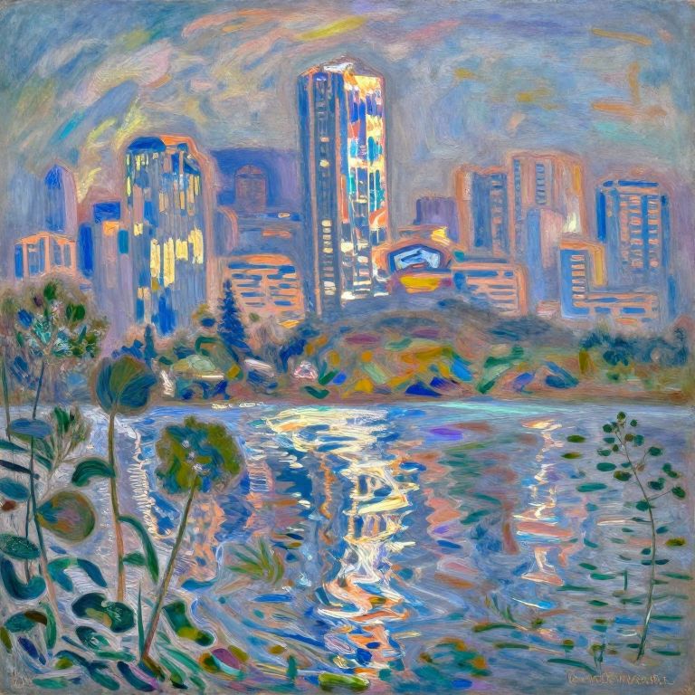 This is a vibrant, impressionistic painting of a city skyline at sunset, done in bold, expressive brushstrokes. The sky is a mix of blue and orange hues, reflecting off the tall buildings, which are illuminated with bright yellow and white lights. A reflective river runs through the foreground, shimmering with blues, greens, and oranges. The lower part of the painting features lush, green foliage and trees. The buildings, varying in height and design, are mostly blue and purple with occasional orange highlights. The overall style is reminiscent of Claude Monet's impressionist technique, with a focus on light and color. The artist's signature is visible in the bottom right corner.