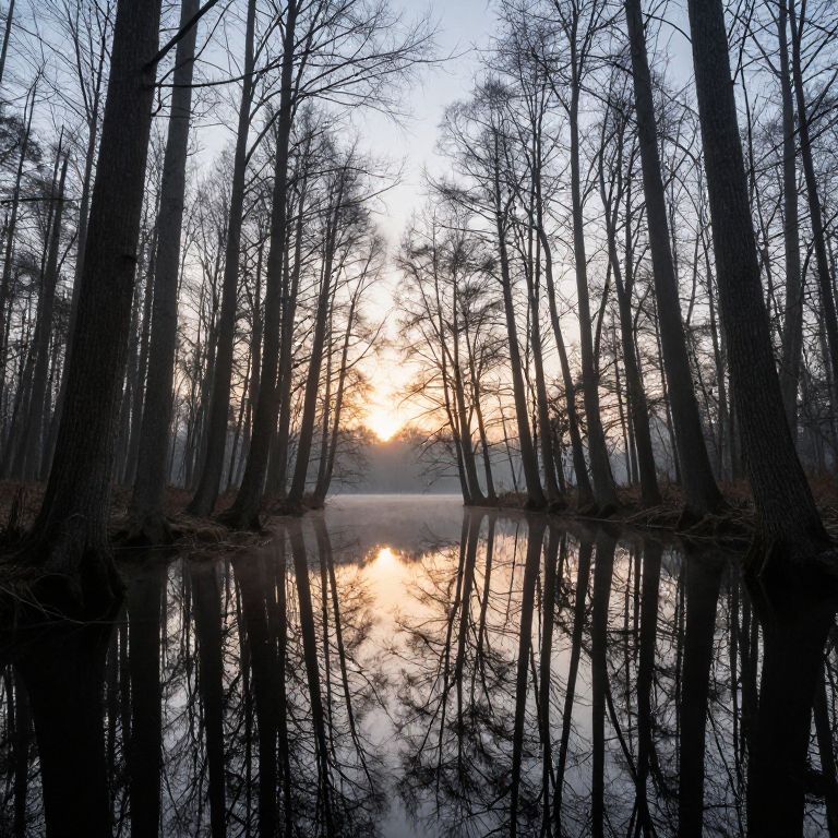 Silent forest whispers through bare, towering trees that stand mirrored in a tranquil pool of water, reflecting the ethereal glow of a distant sunrise and casting an otherworldly stillness over the scene.