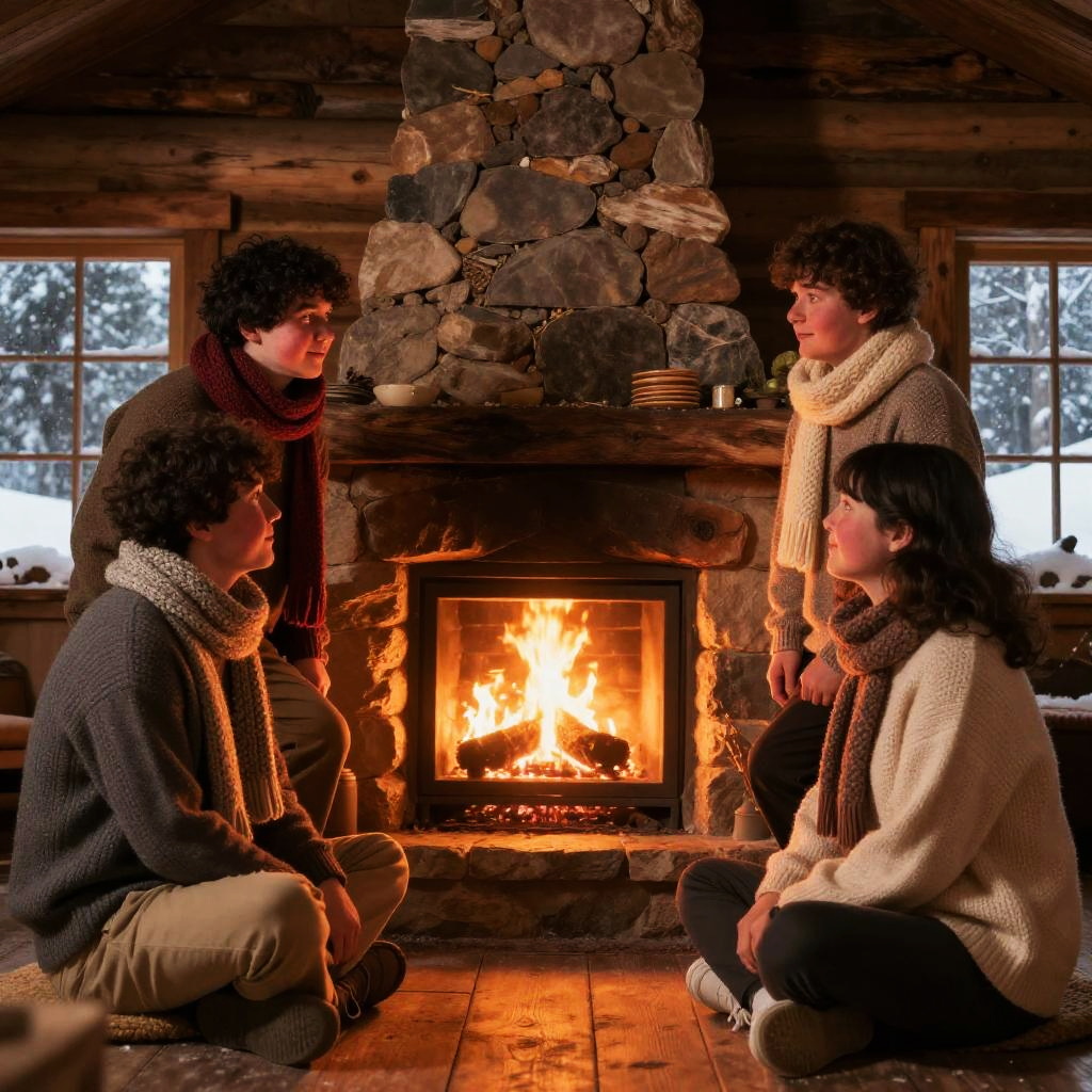 Chubby cheek characters gathered around a cozy fireplace inside a rustic cabin, winter theme with snow outside, warm glowing light, knitted scarves and sweaters, rich textures in wood and fabric, heartwarming and friendly faces with plump cheeks, intimate and inviting atmosphere.