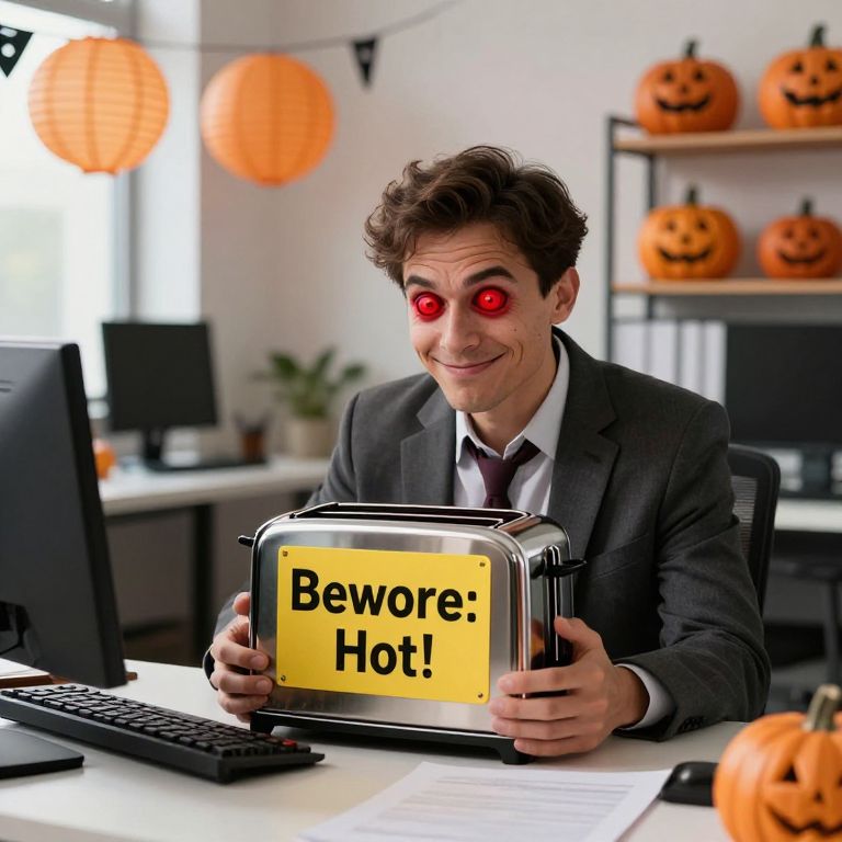 A humorous coworker dressed as a suspicious-looking toaster with glowing red eyes and a 'Beware: Hot!' sign, sitting at a desk during a Halloween office party, genuine smile, expressive eyes, office setting with paper lanterns and pumpkins on shelves, realistic photo capture.