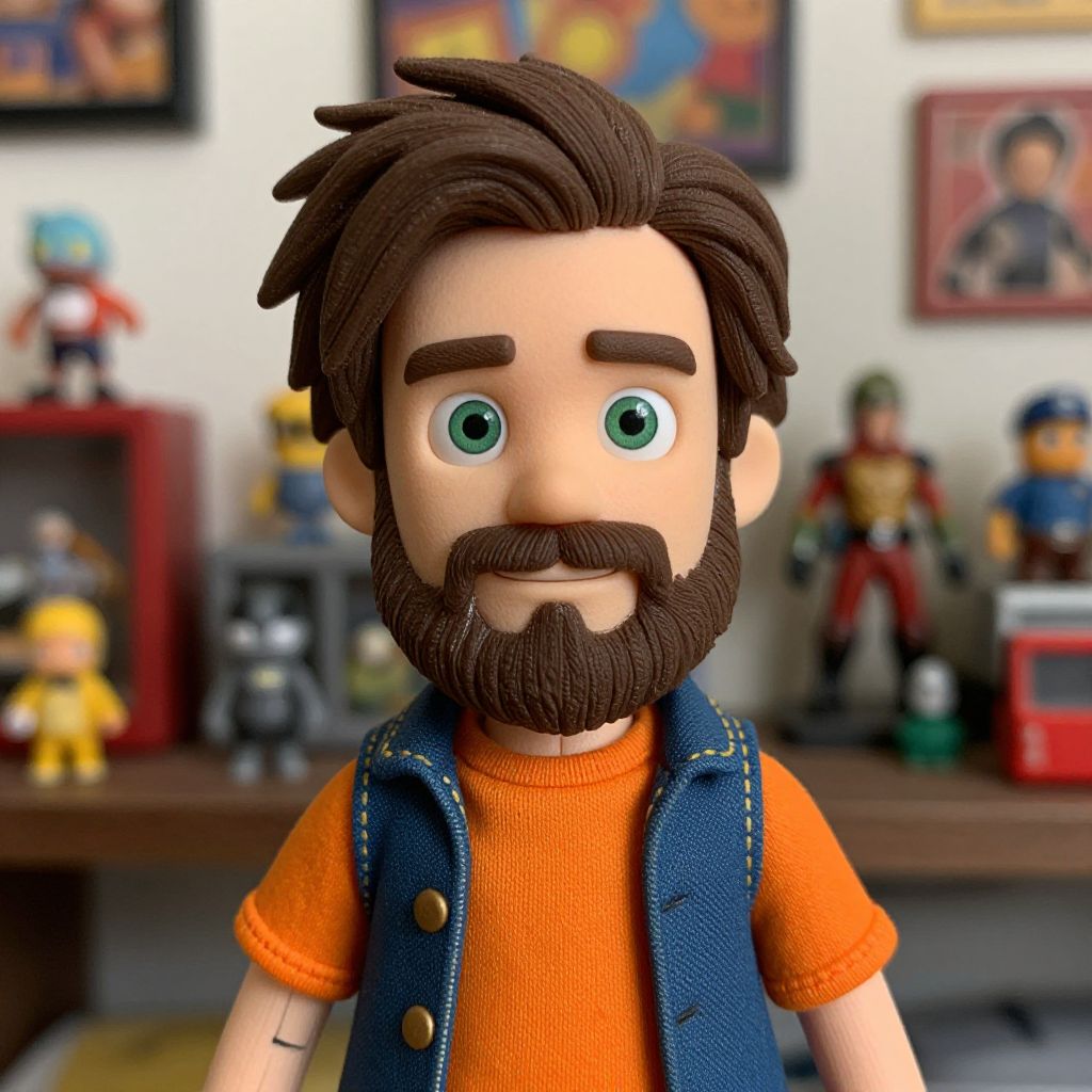 Rusty cute italian man 27 with brown hair and beard and green eyes and lots of geeky collectable things in background,