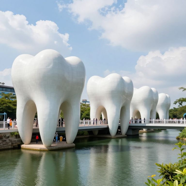 Photograph of a public art installation featuring four large, white, sculptural molar teeth standing on pillars over a reflective waterway. The teeth are smooth and glossy, with exaggerated, rounded shapes. People are walking on a white pedestrian bridge that spans between the teeth. The background includes a clear blue sky with scattered clouds and green trees. The scene is brightly lit with natural daylight. The water below is calm, reflecting the teeth and bridge. The overall style is modern and surreal.