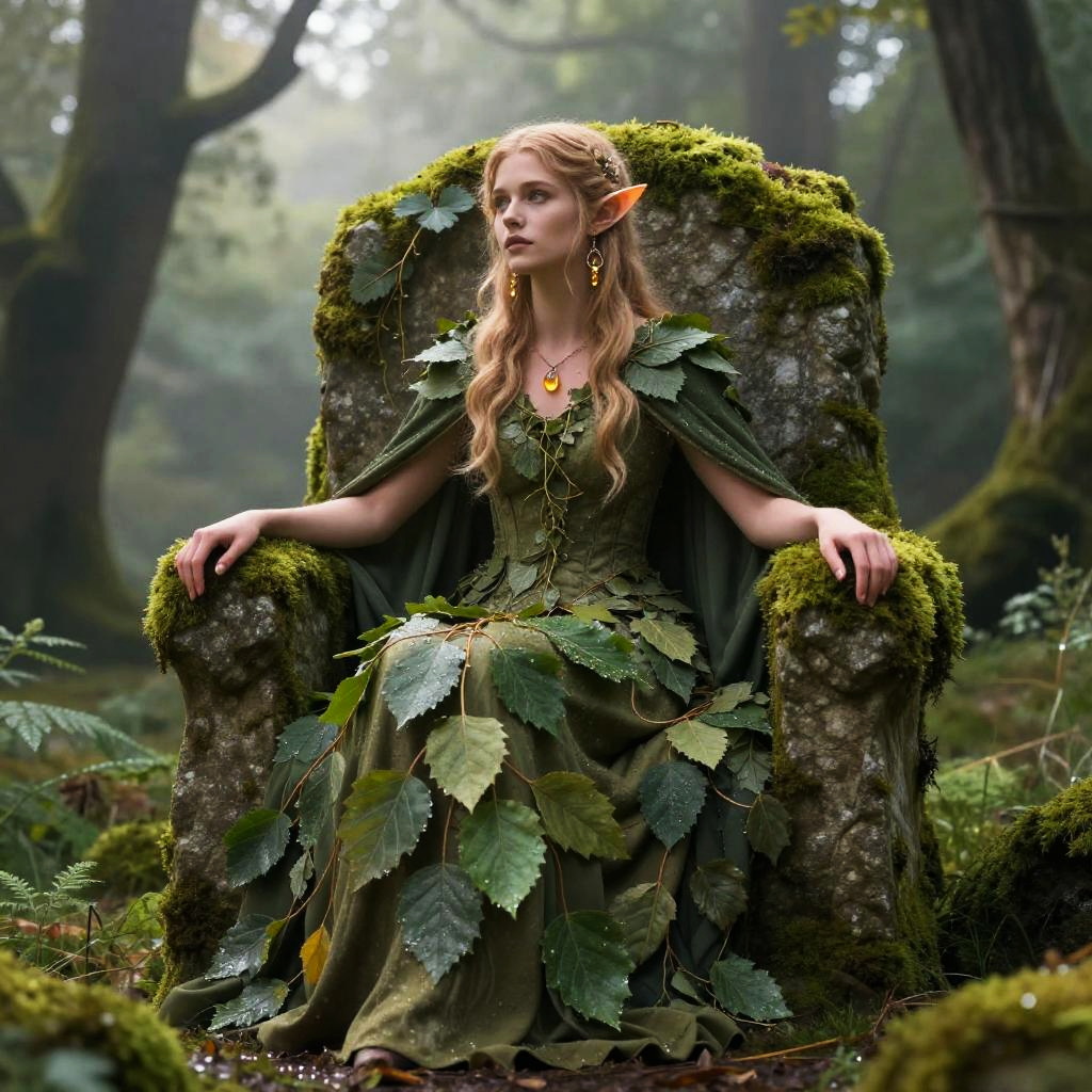 A majestic elf queen seated on an ancient stone seat overgrown with moss, surrounded by a hidden glade bathed in soft dawn haze, her cloak of delicate emerald leaves, adorned with earrings crafted from dewdrops and vines, gentle amber glow slipping through treetops, mystical and regal atmosphere