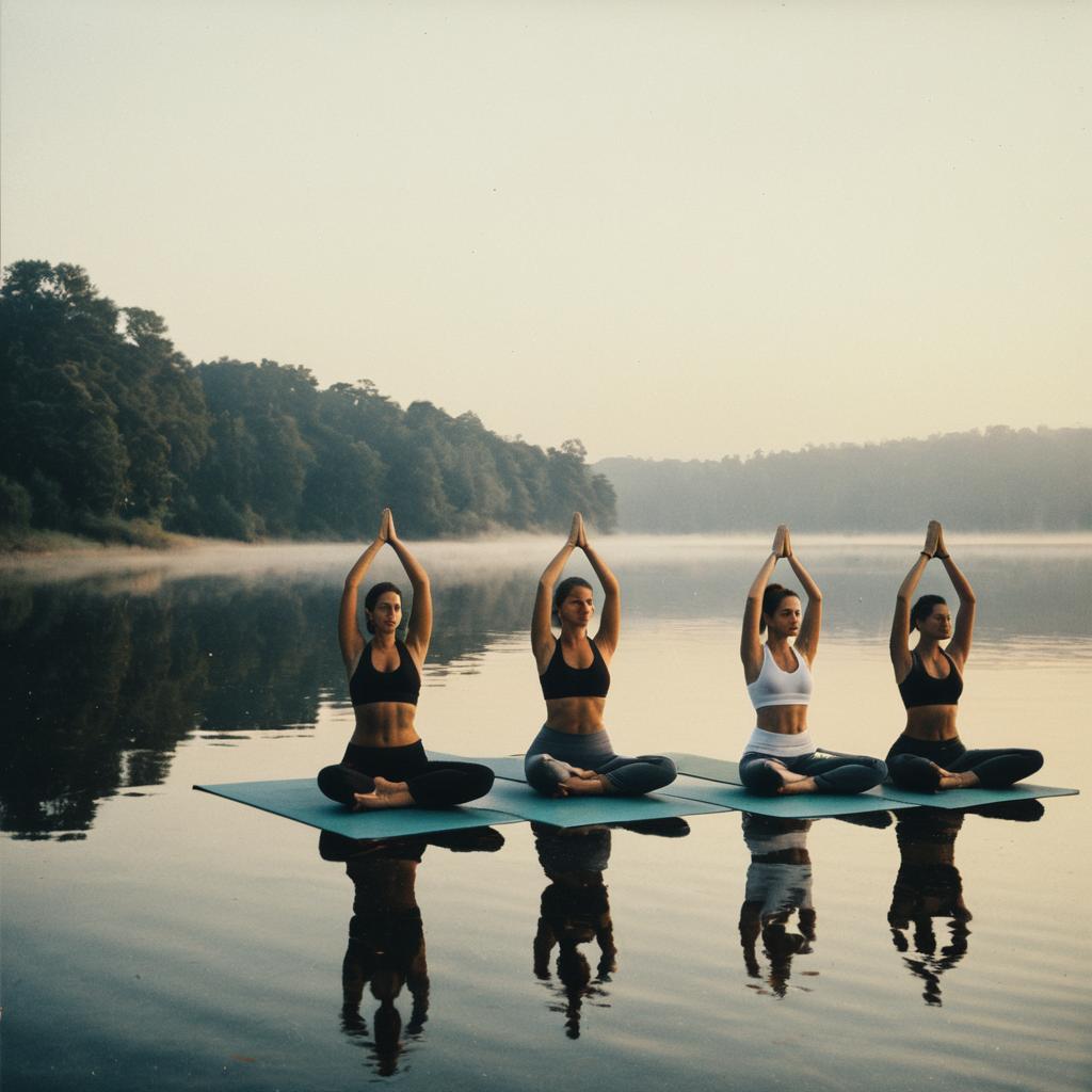 An ethereal being character performing a yoga pose in a futuristic, minimalist room, translucent texture, surreal, flowing limbs, silver sweatbands, ice blue mat, contrast between organic and industrial, inspired by H.R. Giger