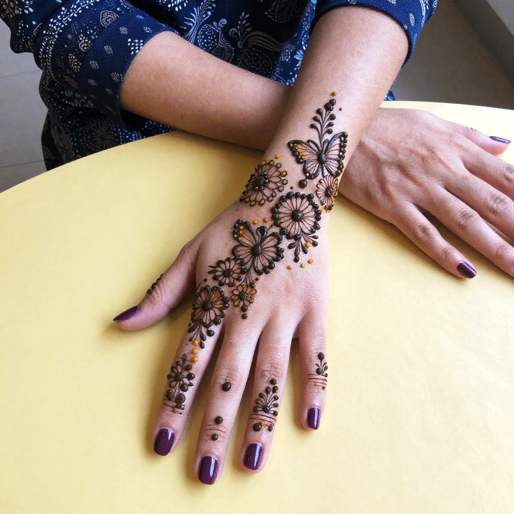 Photograph of a hand with intricate black henna designs covering the fingers and palm. The henna features floral and butterfly patterns with small yellow dots. The person has dark purple nail polish and wears a blue, patterned long-sleeve shirt. The hand rests on a yellow surface, with another hand gently touching the back. The lighting is bright, highlighting the henna's details.