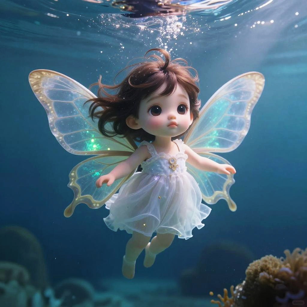 Digital illustration of a cute, big-eyed fairy doll with translucent wings, floating underwater in a white, frilly dress. Sunlight filters through the water