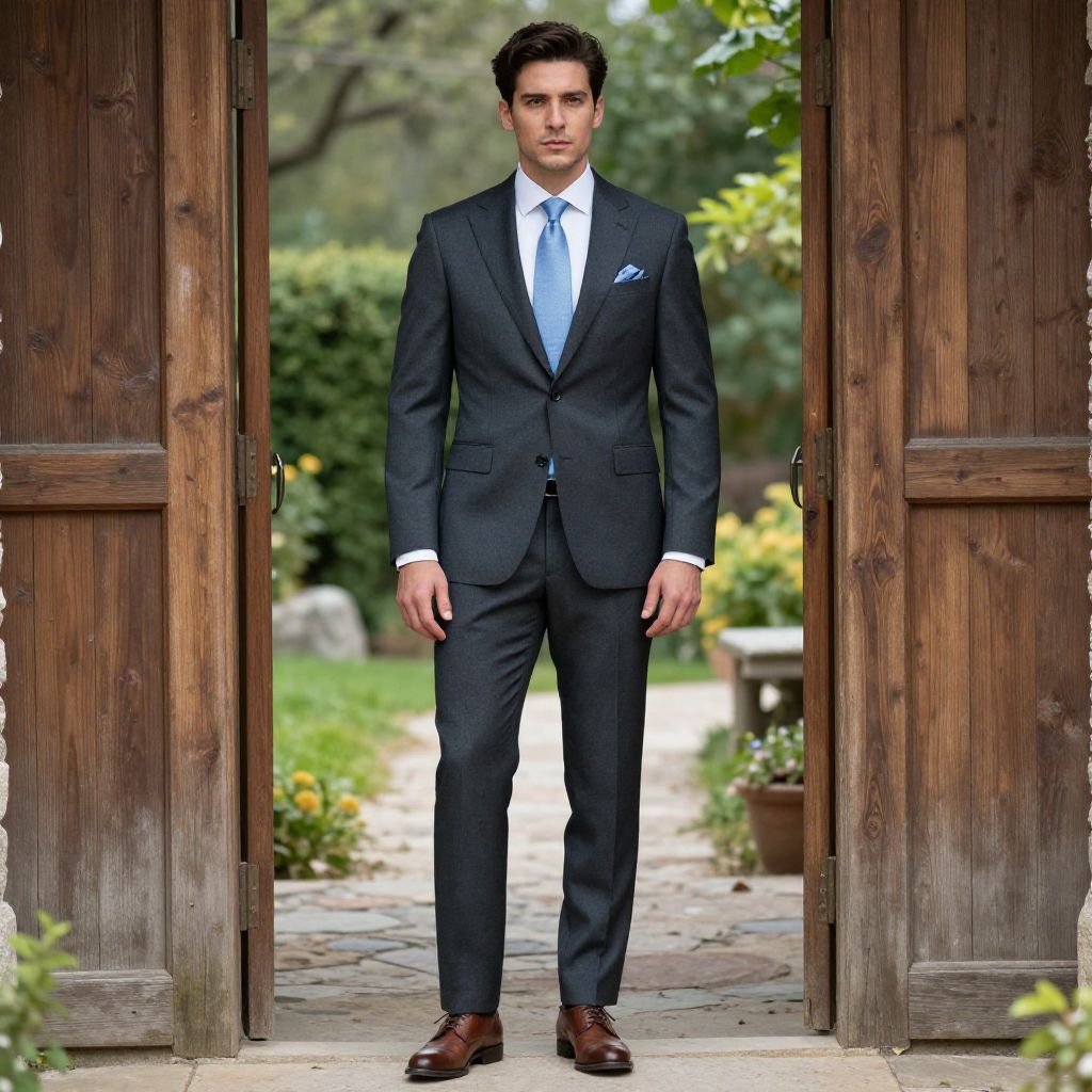 Photograph of a handsome, dark-haired man standing in a rustic wooden doorway. He's wearing a dark gray, tailored suit with a white dress shirt and a light blue tie, paired with brown leather shoes. He has a serious expression and a pocket square in his left breast pocket. The background shows lush greenery and a stone pathway, adding a natural contrast to his formal attire.