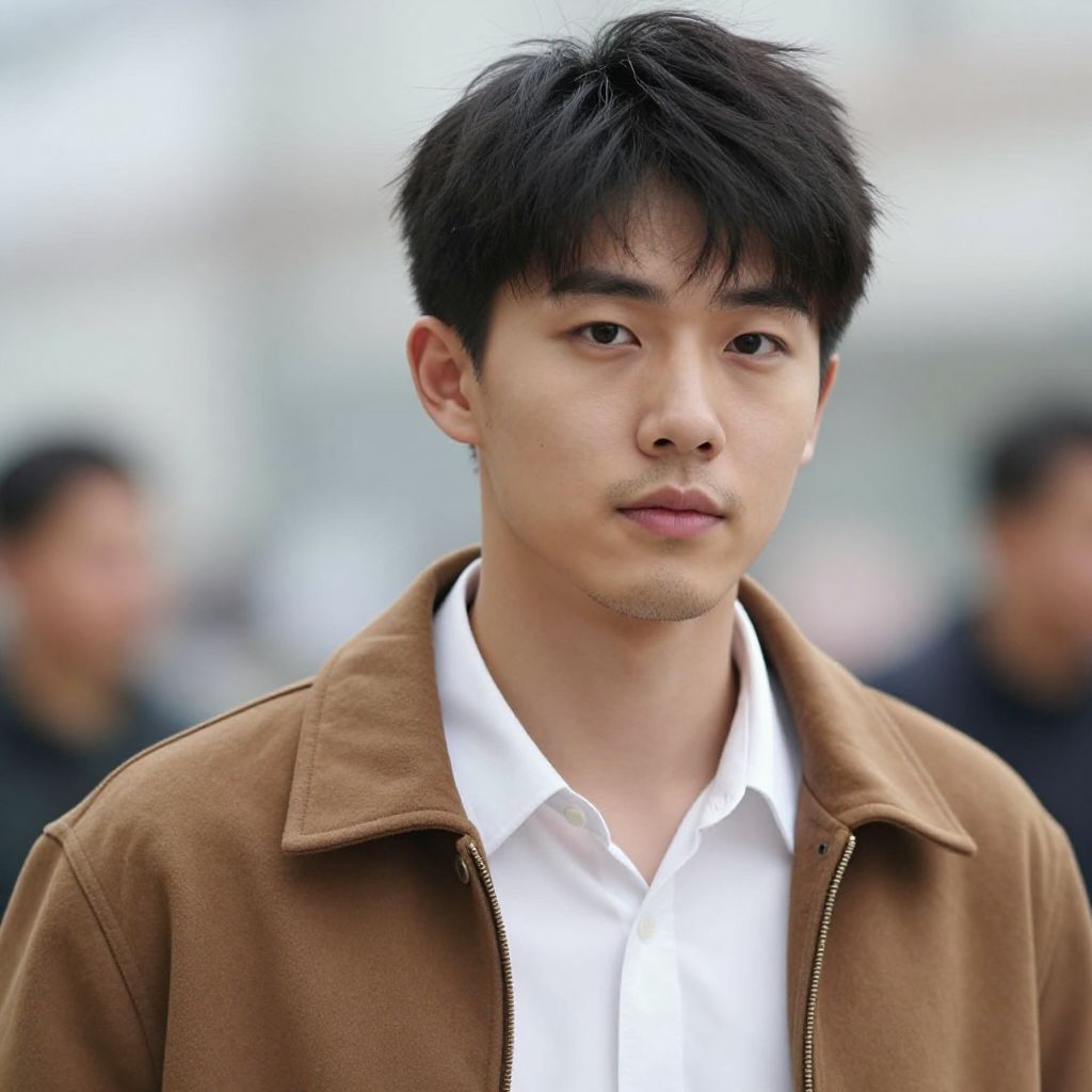 Photograph of an Asian man with short black hair and a trimmed mustache, standing against a plain white background. He has a light skin tone and is wearing a brown tweed blazer over a white dress shirt with the collar open. His expression is neutral, and he gazes directly at the camera. The blazer has a textured, slightly coarse fabric, contrasting with the smoothness of the white shirt. The overall style is formal and professional.
