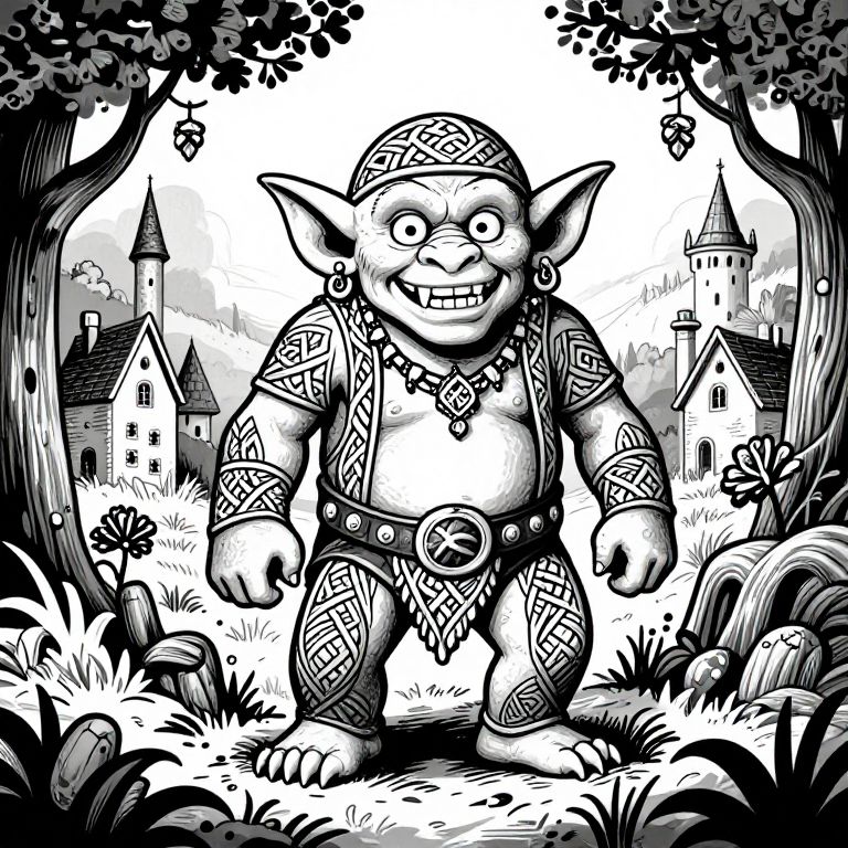 A detailed, black and white illustration of a troll with intricate Celtic designs, surrounded by nature and medieval houses in the background.