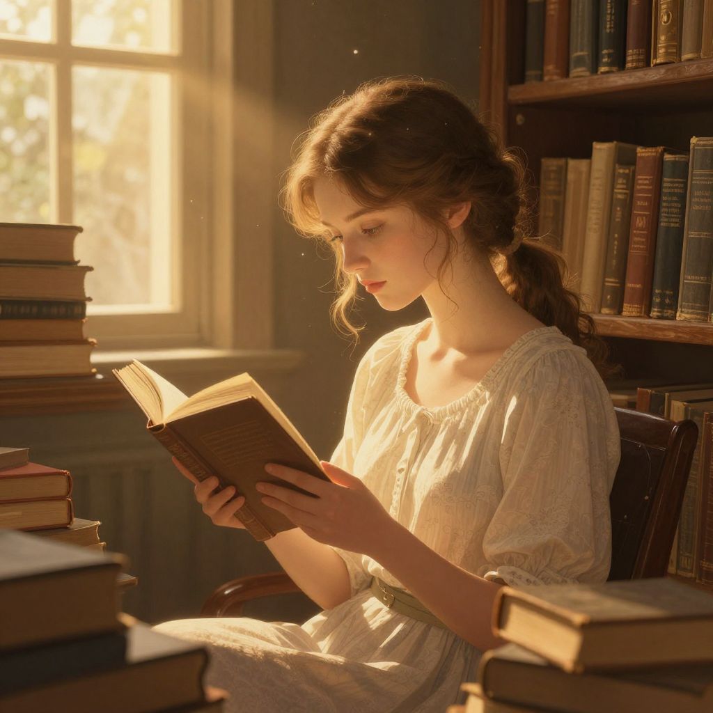 A serene, vintage-style illustration depicts a young woman engrossed in reading amidst a sunlit library, where the warm golden hour light casts a magical glow over the ancient books, evoking a sense of timeless wisdom and the whispered secrets of knowledge.