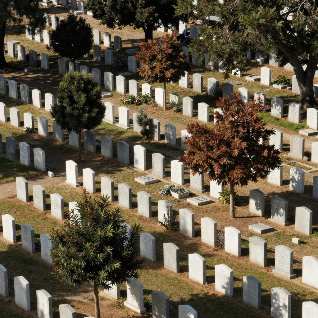 Photograph of a sunlit cemetery with rows of white gravestones, interspersed with dark green and red-leaved trees, casting shadows on