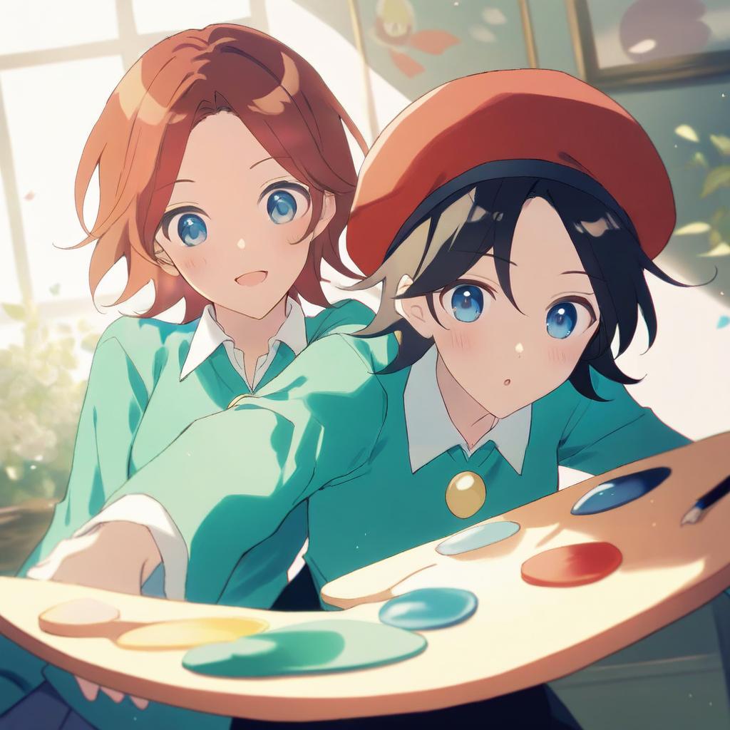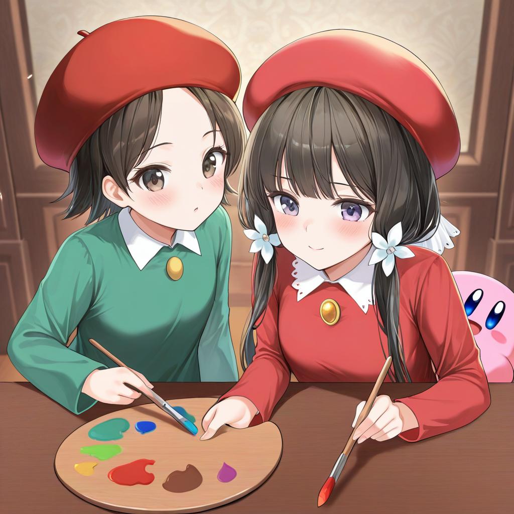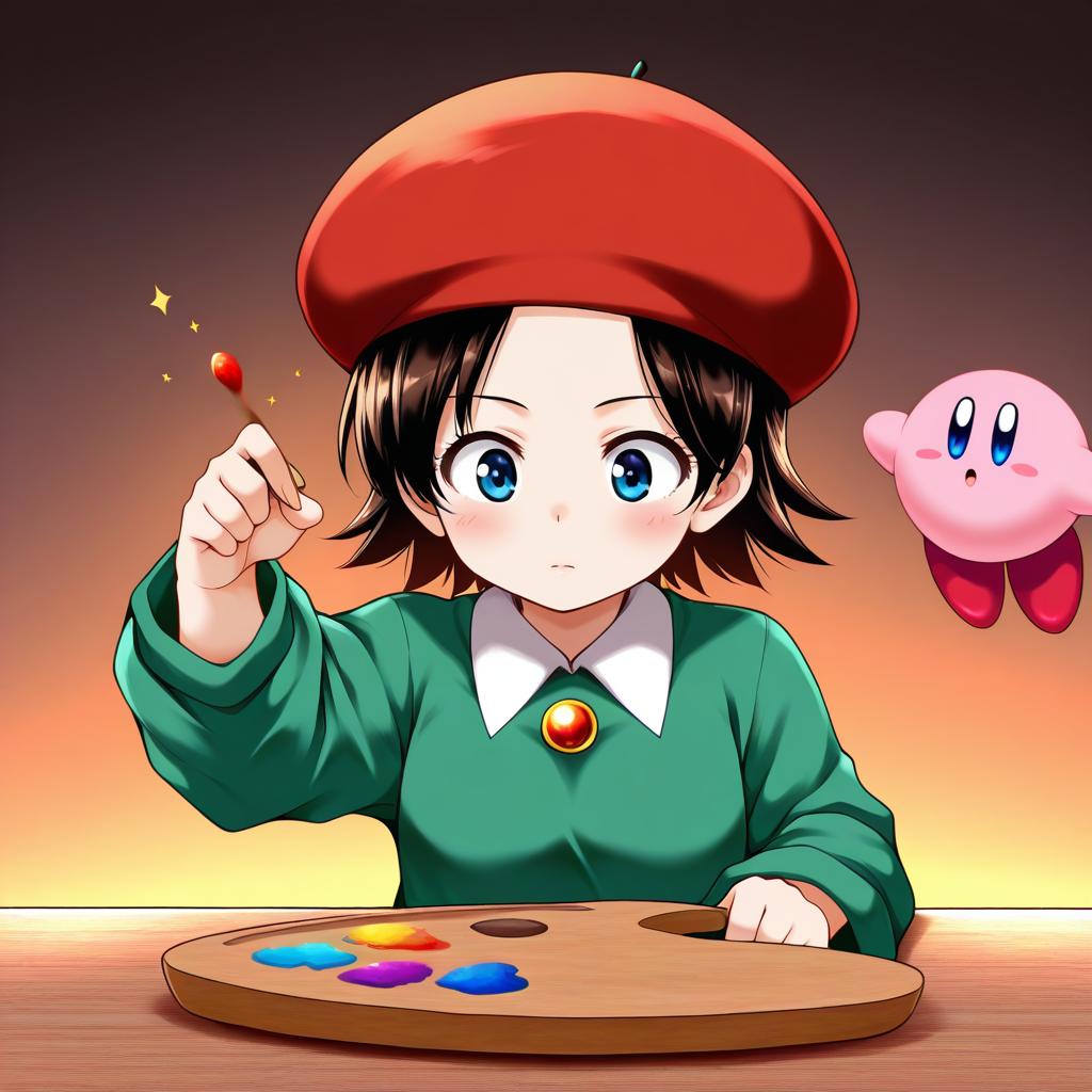 Adeleine, kirby (series), 1girl, blue eyes, short hair, black hair, brown hair, red headwear, long sleeves, palette (object), beret, red hat, by artist lillly, illustrious