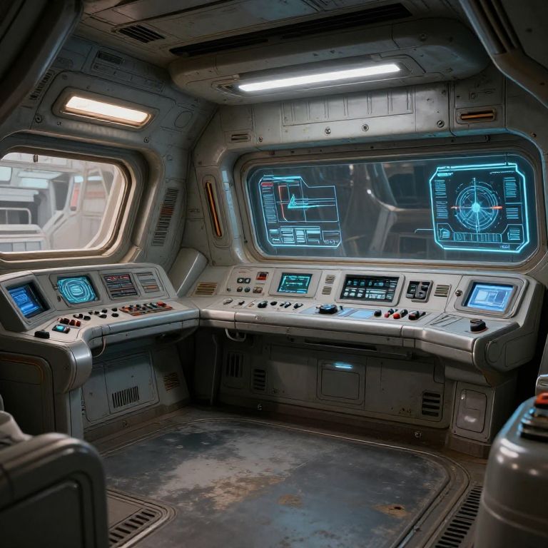 Photograph of a futuristic spaceship cockpit interior. The curved, metallic walls feature numerous control panels with various buttons, switches, and digital displays. Two large, illuminated screens show blue, holographic-style interfaces with data and maps. A small, rectangular window on the left side reveals a glimpse of an adjacent white-lit corridor. The floor has a worn, metallic texture. Bright overhead lights and a mix of red and blue indicators add to the high-tech ambiance. The overall design is sleek and functional, with a sense of advanced technology.