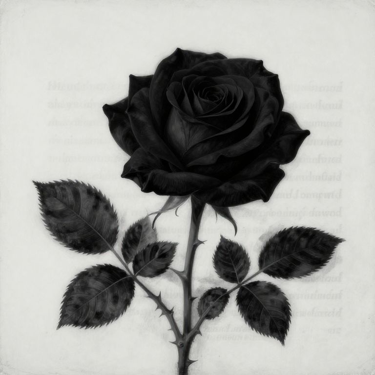 Black rose painting, a dark botanical illustration style painting featuring a black rose with detailed leaf patterns, surrounded by thorny branches, minimalist background with faint vintage script, classical and moody artistic vibe