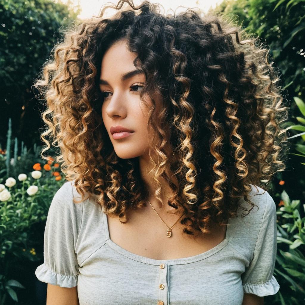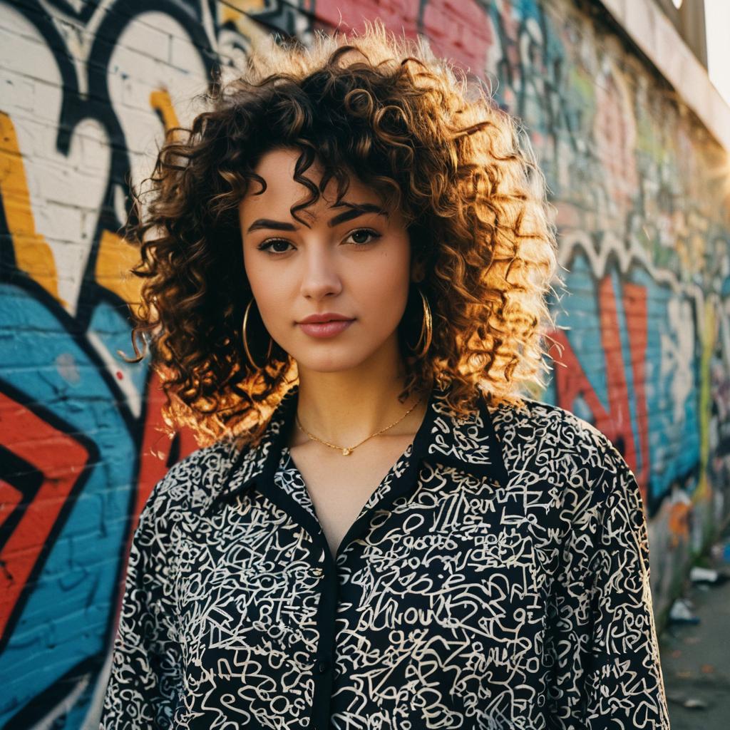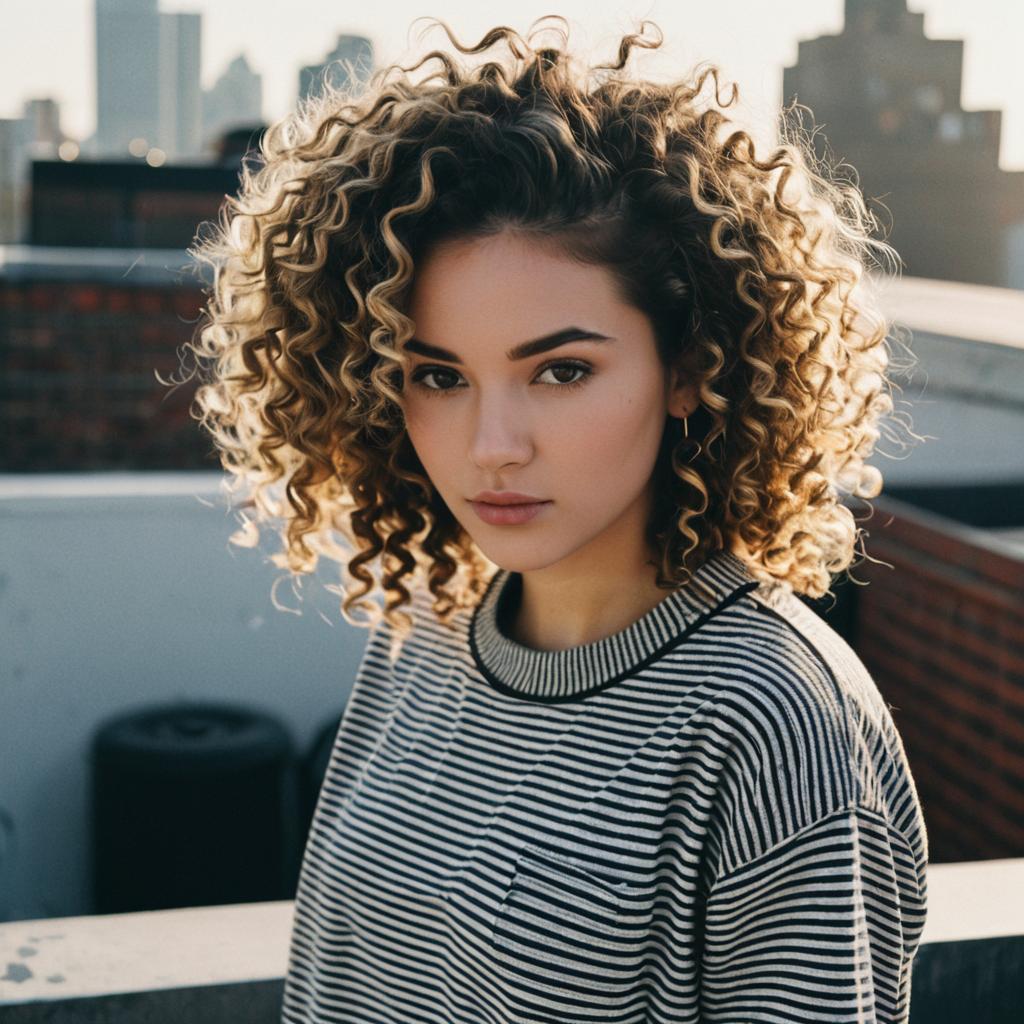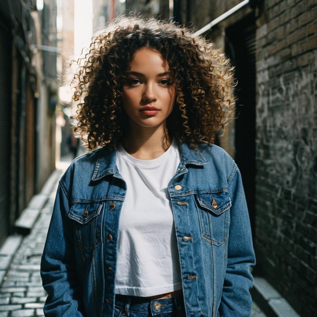 Layered Curls hairstyle on teenage girl, wearing denim jacket and white t-shirt, in urban street corner, captured in fashion editorial style with golden hour sunlight.