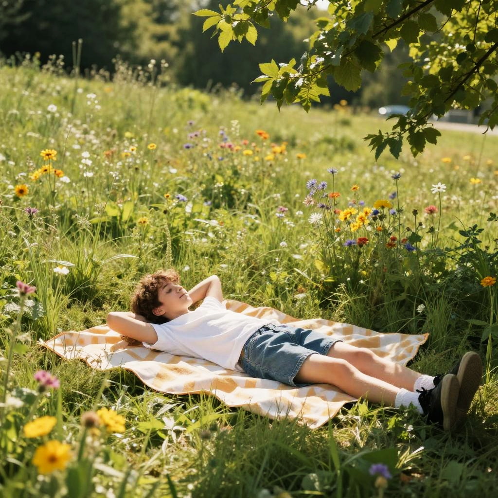Teen sunbathing on a grassy hill, picnic blanket spread out, wildflowers around, radiant sunlight filtering through tree leaves, serene and peaceful summer afternoon