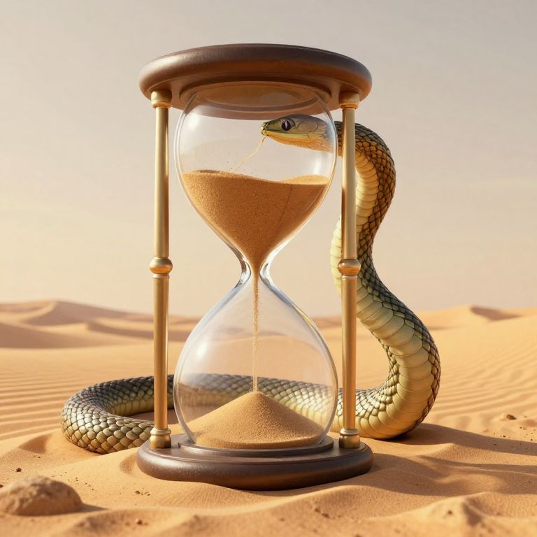 A surreal 3D-rendered depiction of a colossal serpentine hourglass, coiled and swallowing its own tail, seamlessly integrates sand flowing through its body against a vast, golden desert backdrop, symbolizing the cyclical passage of time within a quadruple-timeline narrative.