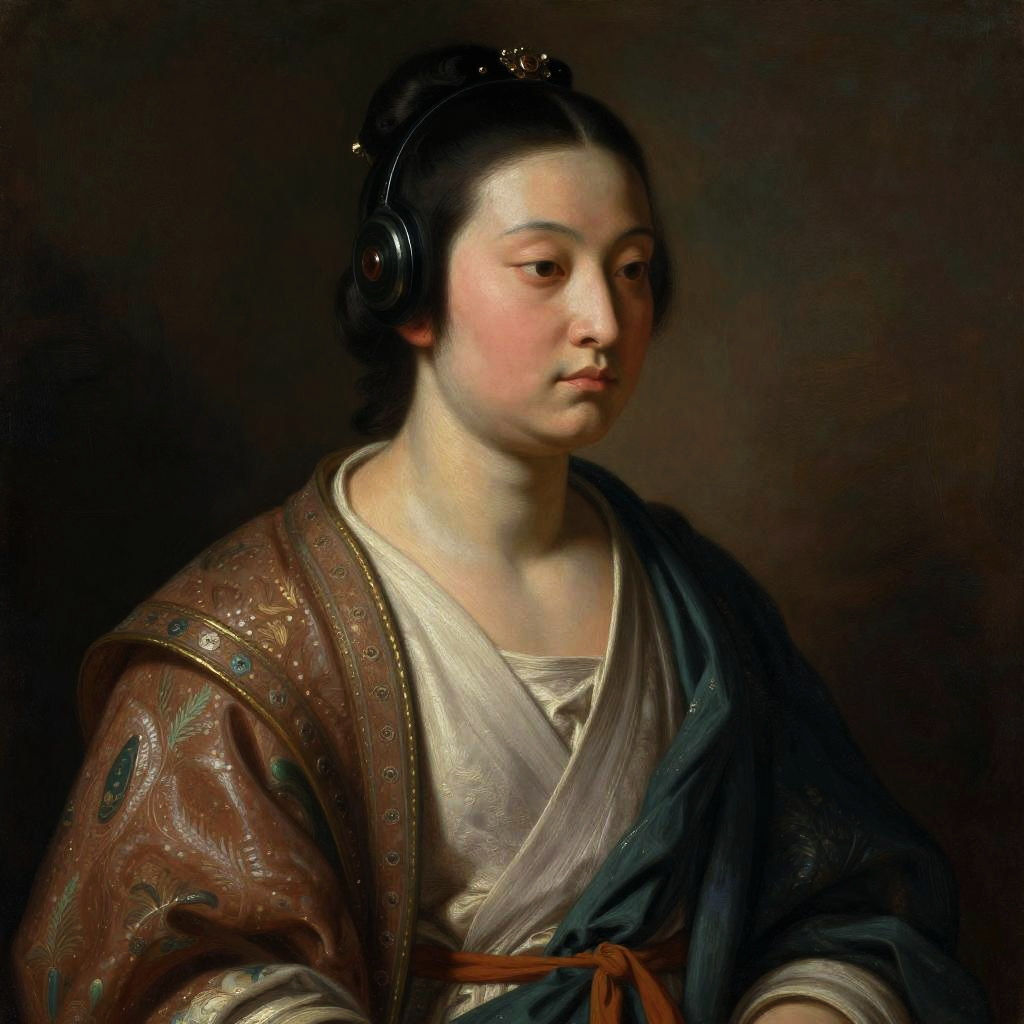 AI remake image of an ancient painting reimagined with modern AI enhancements, featuring hyper-realistic textures, dynamic lighting, and futuristic elements, combining traditional art with high-tech aesthetics in a seamless digital composition.