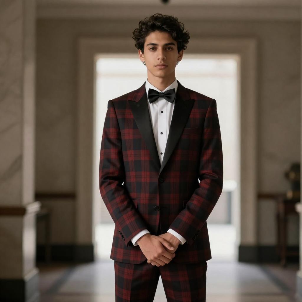 Photograph of a young man with dark hair, wearing a red and black plaid suit with a black bow tie and white shirt. He stands in a dimly lit room with a marble wall and a brightly lit doorway in the background. His hands are clasped in front of him.