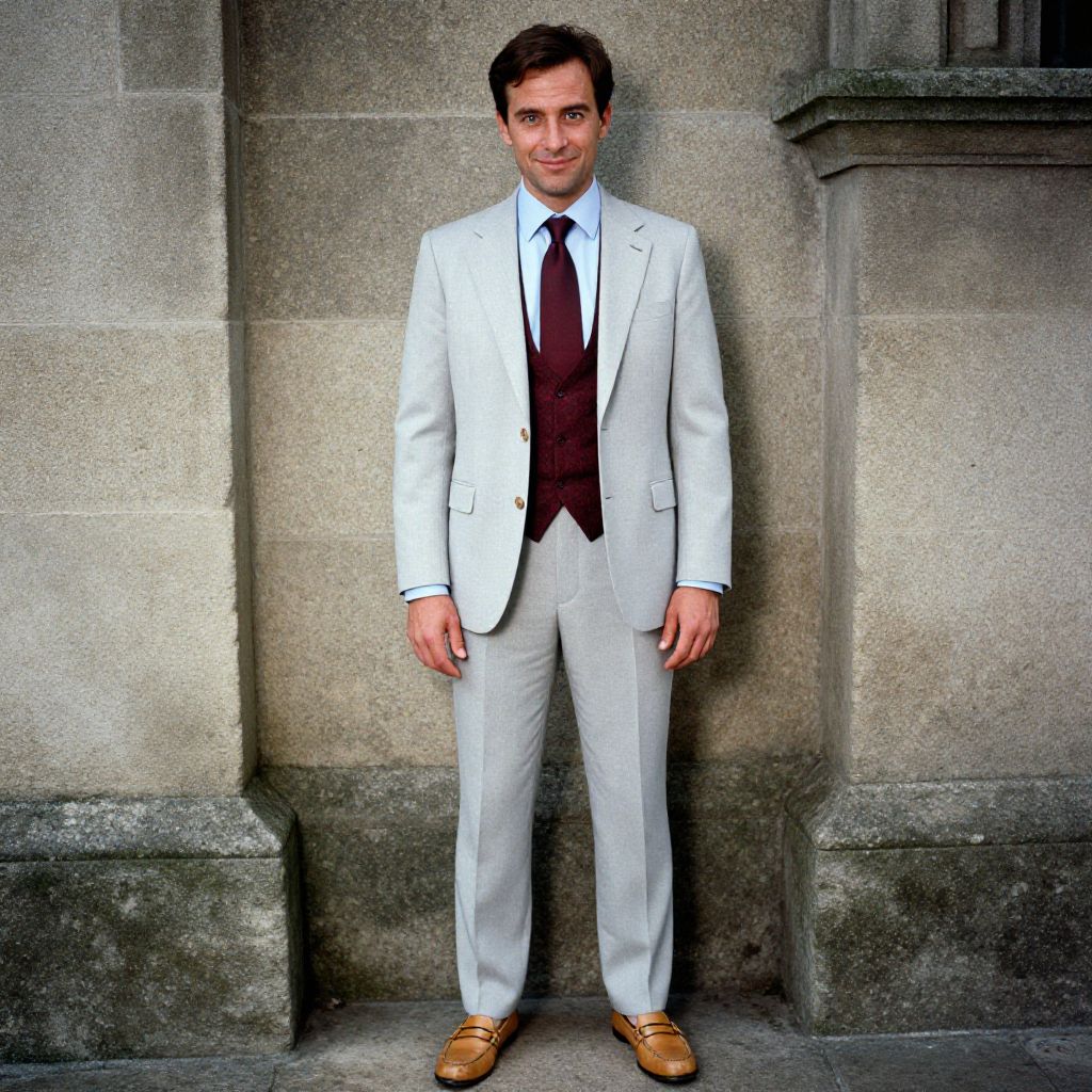 A man, pale grey three-piece suit, light blue dress shirt, solid burgundy tie, burgundy patterned waistcoat, tan leather loafers, ancient stone walls, technicolor analog film stock, confident expression, soft smile. Man has masculine face and piercing eyes