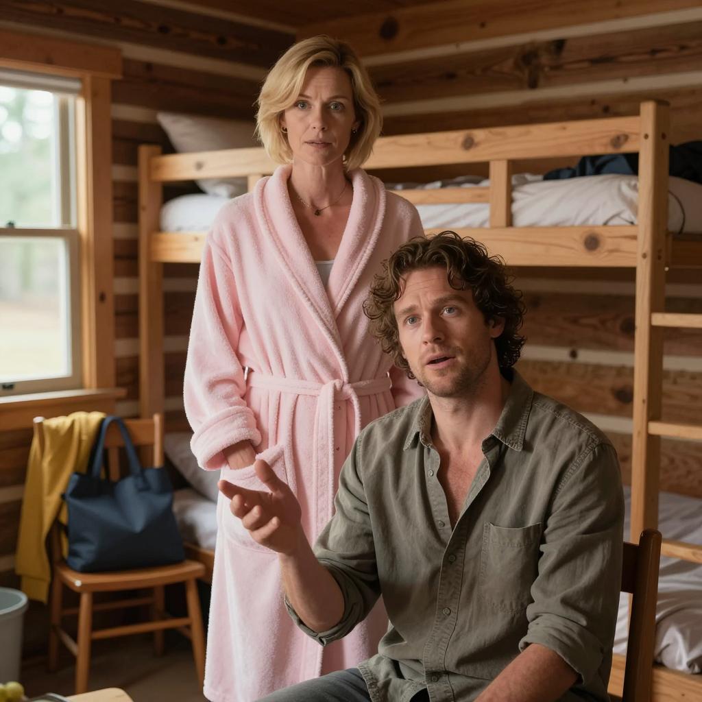 Photograph of a man and woman standing in a brightly lit boutique. Man with curly brown hair, black button-up shirt, neutral expression. Woman with short blonde hair, purple floral blouse, surprised expression. Red dress on mannequin to their left. Pink walls, mirrored background, various clothing items.