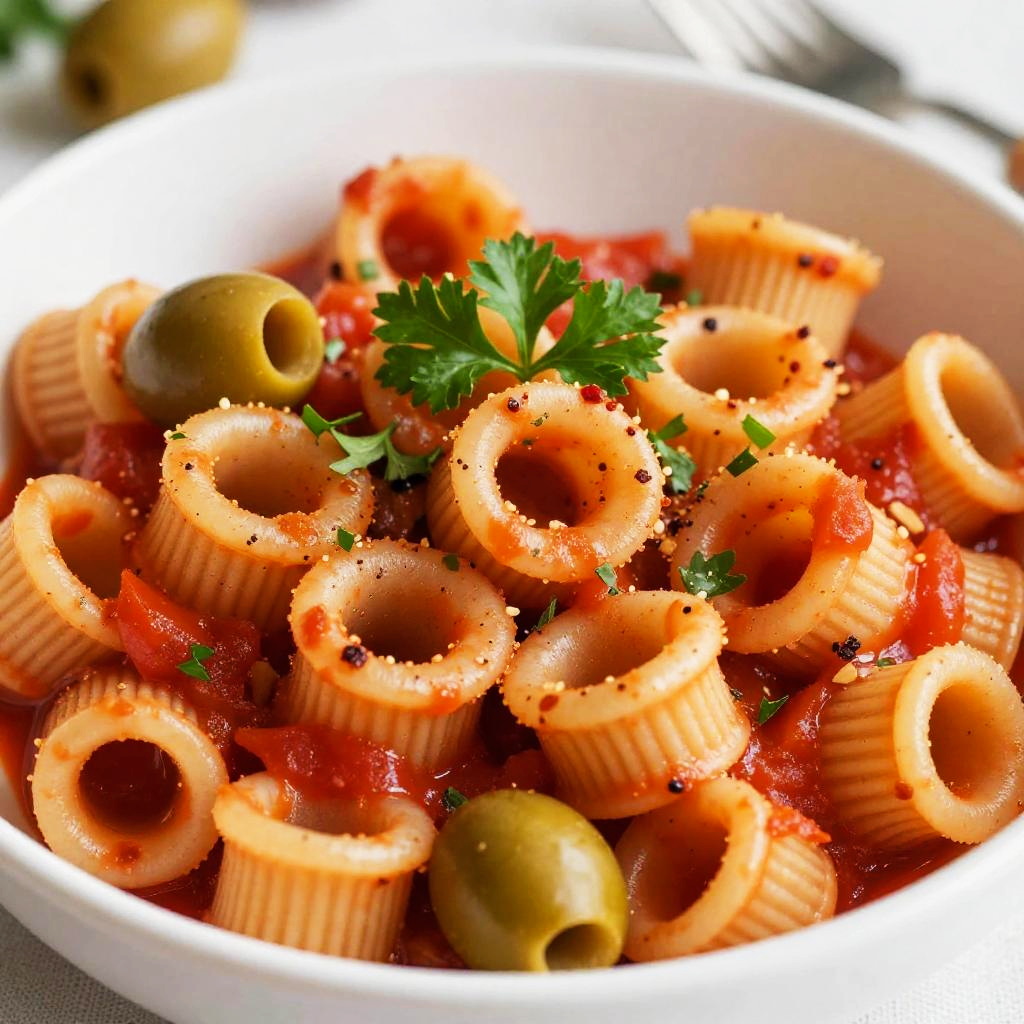 Close-up photo of a white bowl filled with ring-shaped pasta, coated in a rich red tomato sauce. The pasta is topped with fresh green parsley, small green olives, and a sprinkle of red pepper flakes. The vibrant colors and textures create a visually appealing and appetizing dish. The background is blurred, focusing attention on the pasta.