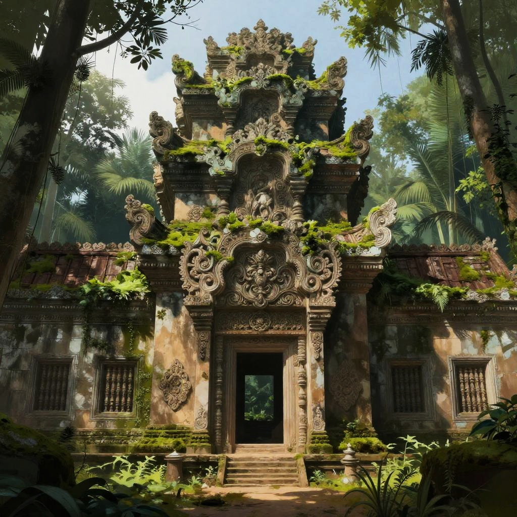 Forgotten temples, dense jungle ruins, baroque, moss green and sandy beige, ancient, mysterious, intricate details, digital painting.