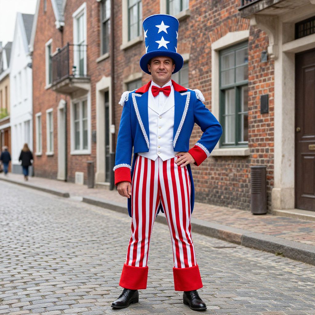 A man dressed in a vibrant patriotic costume stands confidently on a cobblestone street lined with historic brick buildings. The outfit features a tall blue hat with white stars, a blue tailcoat accented with white trim, a white vest, and red-and-white striped pants with bold red cuffs, exuding a theatrical and vintage style.