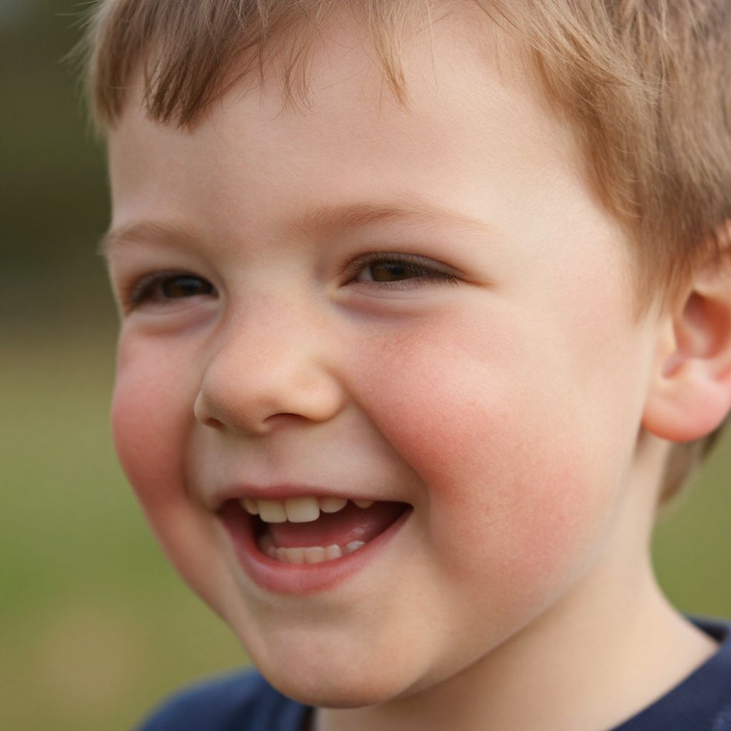 Close-up photograph of a smiling young boy with light brown hair, rosy cheeks, and blue eyes, wearing a dark shirt, set against a blurred