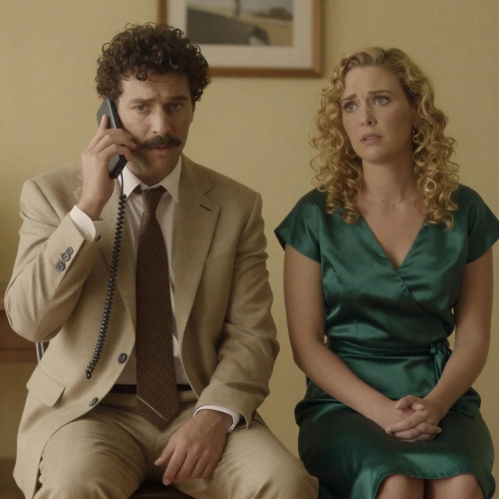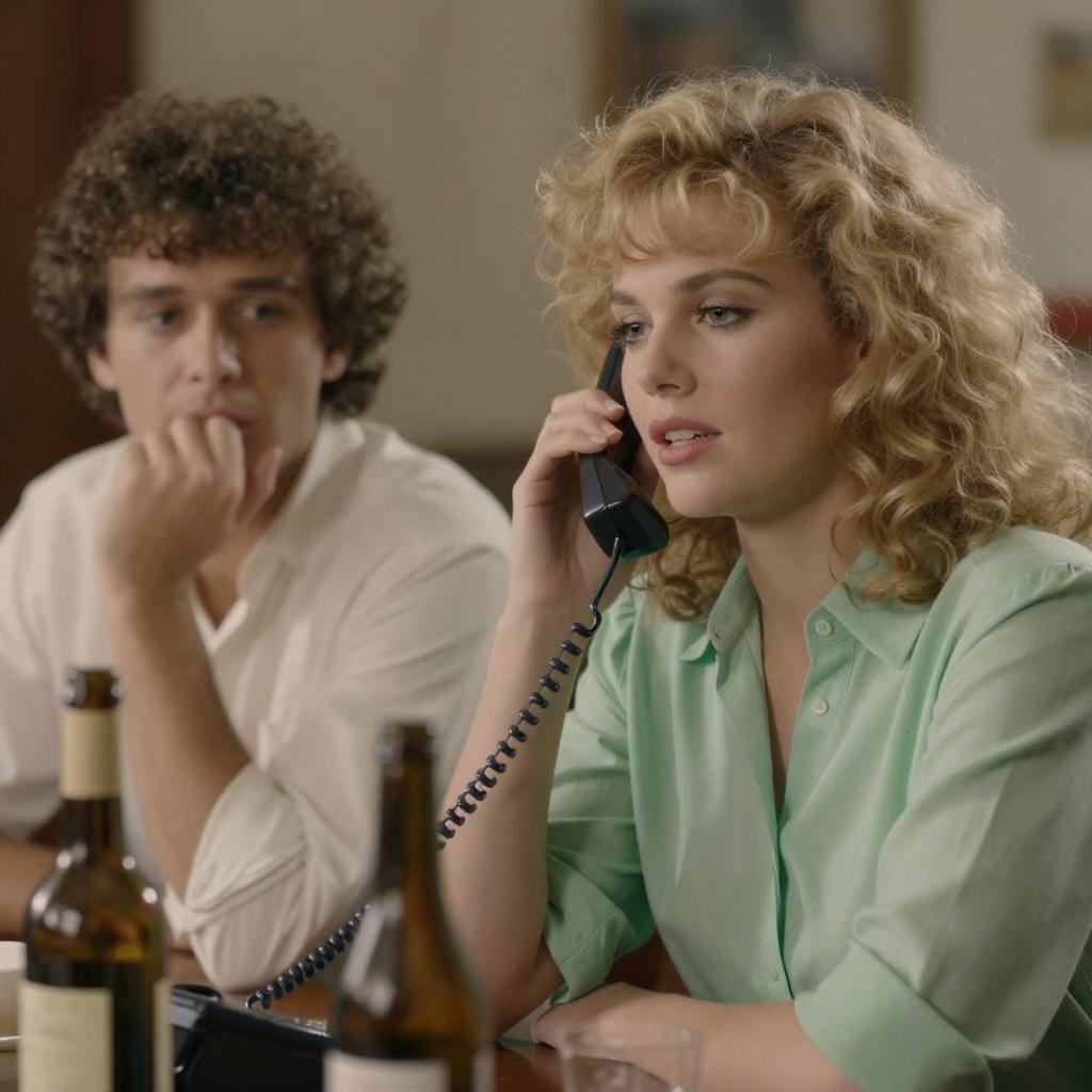 Photograph of a 1980s-style scene featuring a blonde woman with curly hair, wearing a light green blouse, holding a black corded phone to her ear, and a man with curly brown hair, wearing a white shirt, leaning on his hand. They are seated at a table with various bottles and a glass. The background is blurred, suggesting an indoor setting.