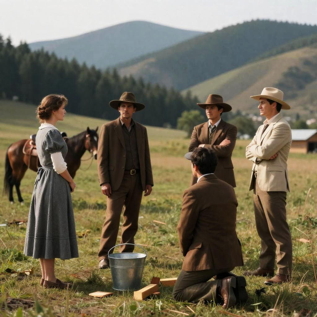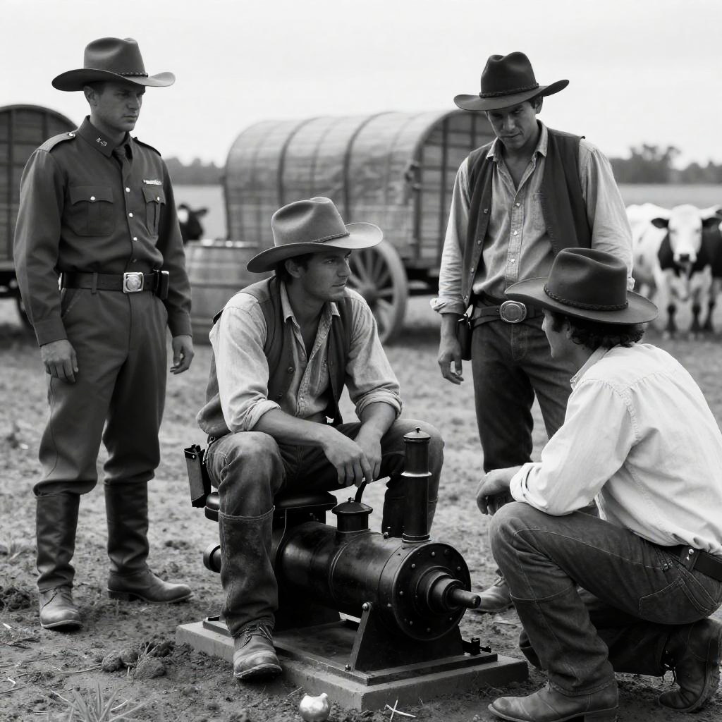 Black-and-white photograph of three men in a Western-style camp. Two men in rugged clothing and hats, one sitting on a steam-powered machine, one standing with intense expression, and one kneeling, talking. Background: covered wagons, barrels, and cows. One man in a military-style uniform with a hat stands to the left. Mud ground, intense expressions, casual conversation, steam machine.