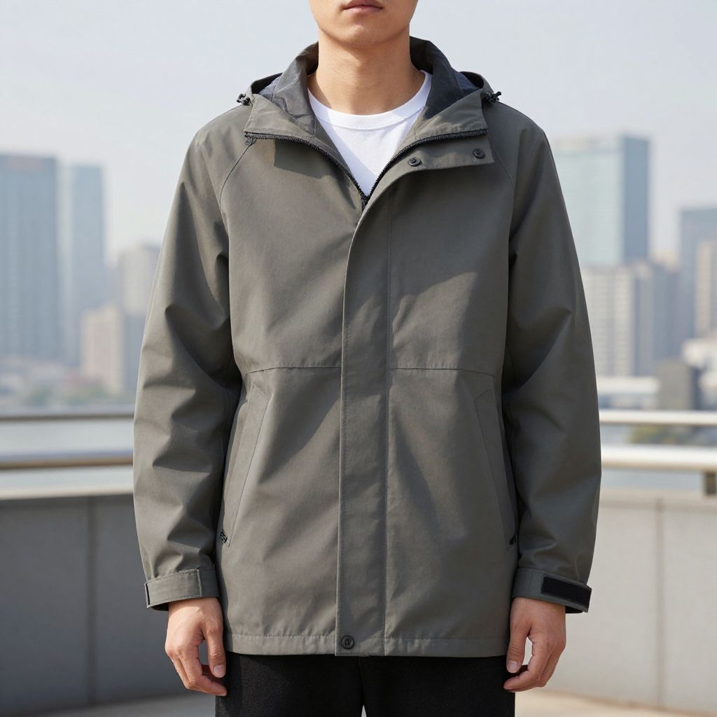 A model wearing a Stylish windbreaker against a city skyline, highlighting the garment's features in natural light, realistic photo