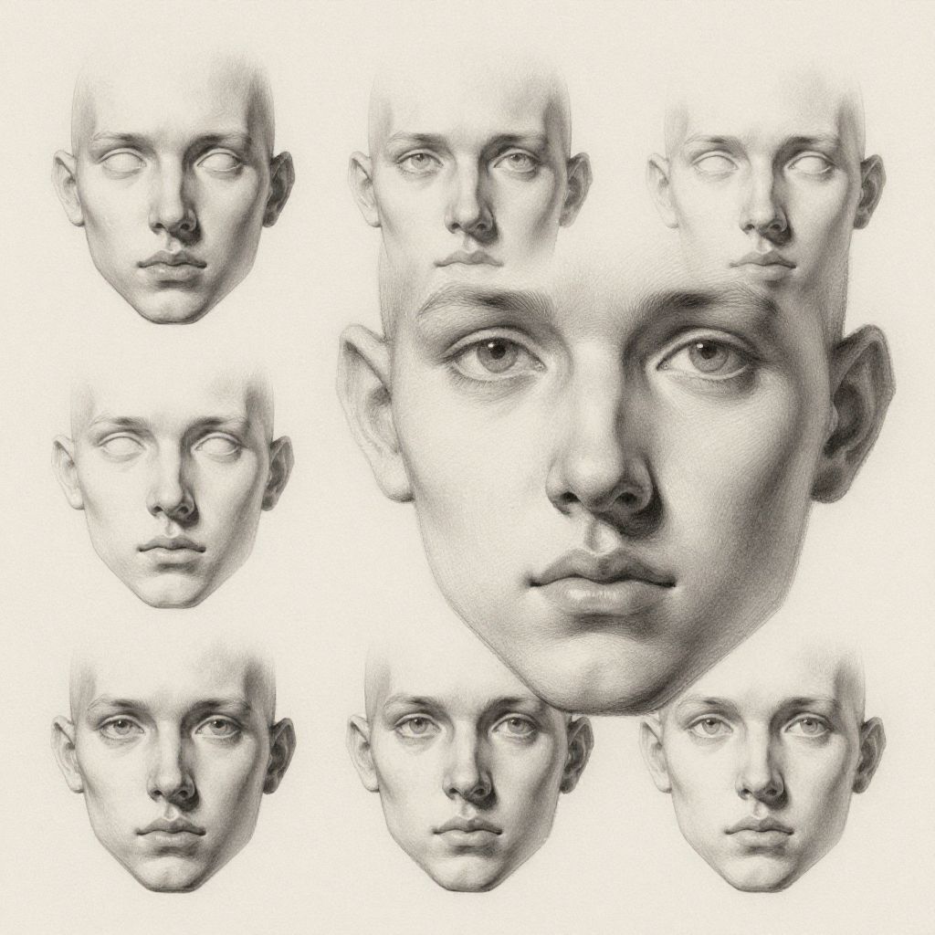 Art face reference featuring a detailed human face with expressive eyes and subtle shading, showcasing various angles and lighting effects, perfect for artists studying facial structure and expression, set against a neutral textured background.