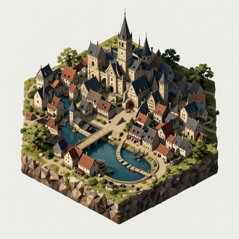 This digital isometric illustration depicts a charming medieval village perched on a rocky island. The village features a central square with a curved, stone bridge crossing a small, blue pond. Surrounding the square are tightly packed, beige and brown stone houses with dark, steeply pitched roofs and several Gothic-style churches with tall spires. Greenery and trees dot the landscape, contrasting with the rocky edges of the island. The overall color palette includes earthy tones, with sunlight casting realistic shadows, enhancing the three-dimensional effect. The scene exudes a quaint, fairy-tale-like atmosphere.
