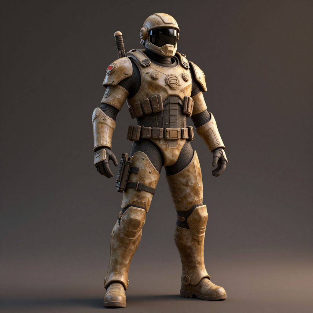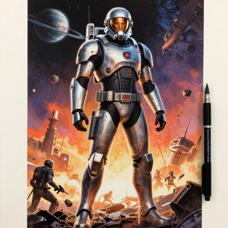 Brush Pen Full body portrait of a cyber punk space marine looking into the camera, a planetary epic battle in the background, movie poster composition Drew Struzan style,